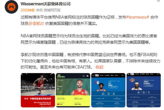 對此,如今李凱爾的經紀公司Wasserman發(fā)布官方聲明表示:“近期有媒體平臺使用NBA官網標注的球員國籍作為證明,發(fā)布李凱爾恢復美國國籍的信息,并不屬實?!?/p>